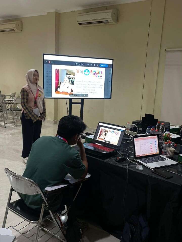 Dalam sesi penilaian, Bunga menyampaikan konsep foto, proses kreatif, dan pesan yang ingin ia angkat. Dokumentasi yang Anda kirim menunjukkan bagaimana ia berdiri percaya diri di hadapan para juri dengan slide karya tampil di layar besar.