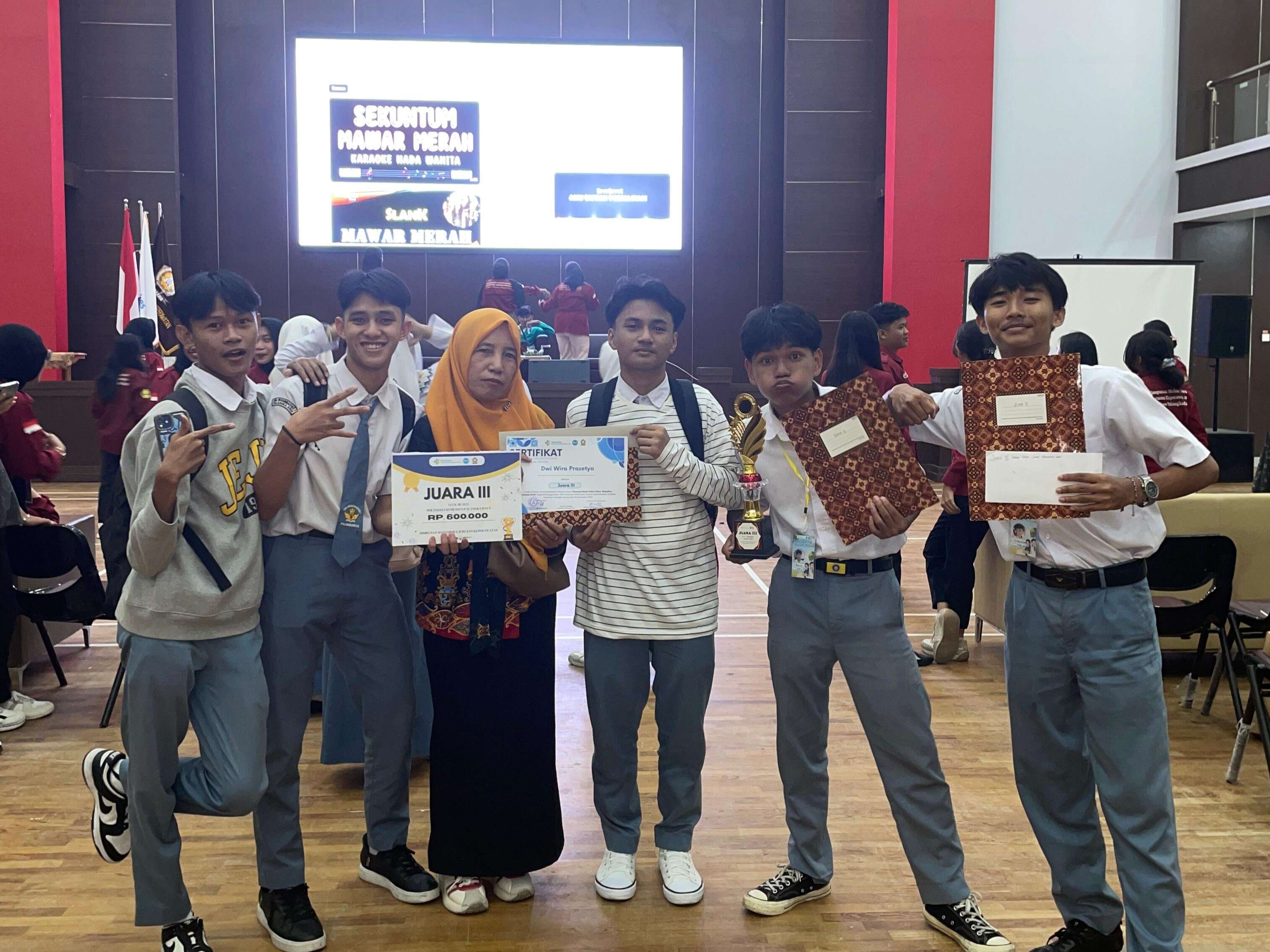 Dalam pelaksanaan lomba, ketiga siswa tersebut didampingi oleh guru pembimbing, Ibu Elvi Susilawati, S.Pd, yang turut memberikan arahan, motivasi, dan dukungan penuh sejak tahap persiapan hingga final.